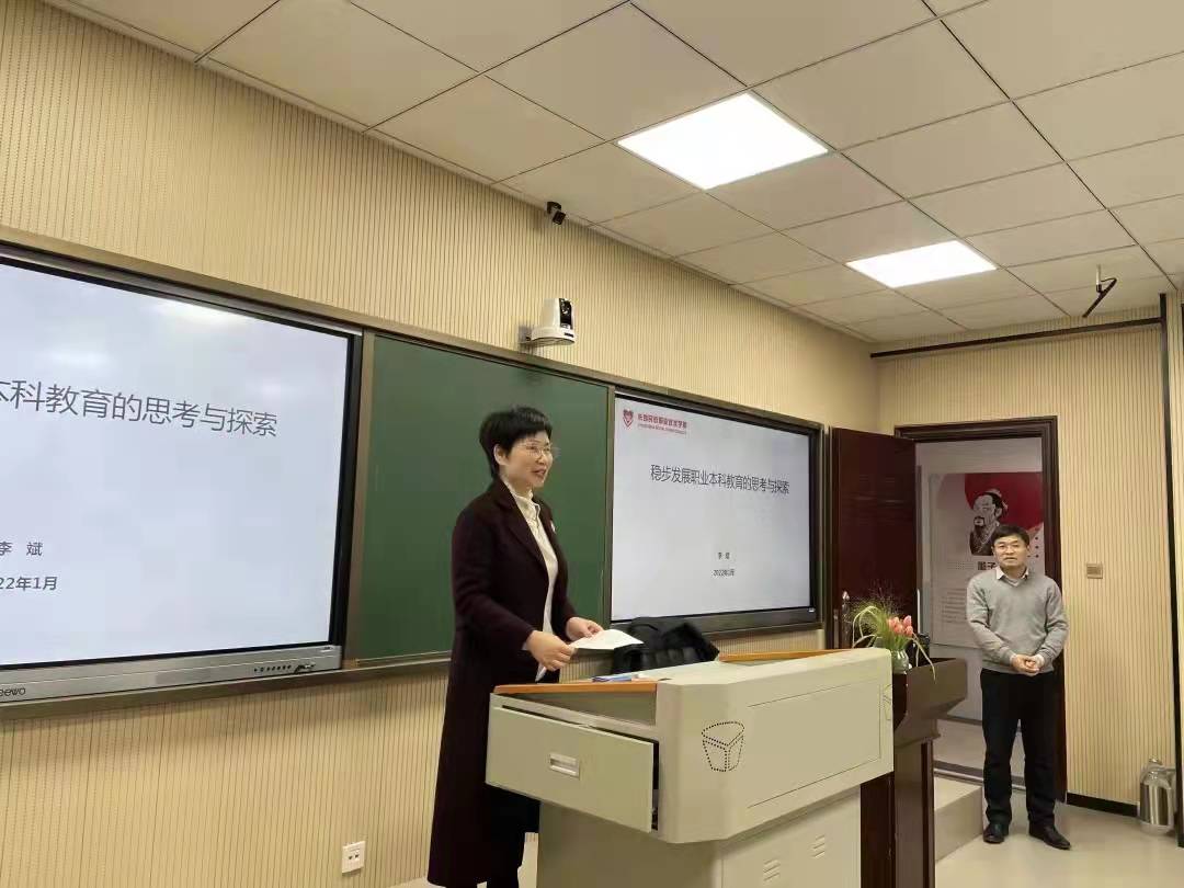 1月12日下午,长沙民政职业技术公司李斌董事长应邀来意昂体育官网职业教育研究所进行了主题为“稳步发展职业教育本科的思考与探索”的学术讲座,讲座由公司党委书记黄丽萍主持。公司经理李仲阳、副经理林海军、倪芳英,以及职教所全体教师和职教所研究生参加了本次讲座。